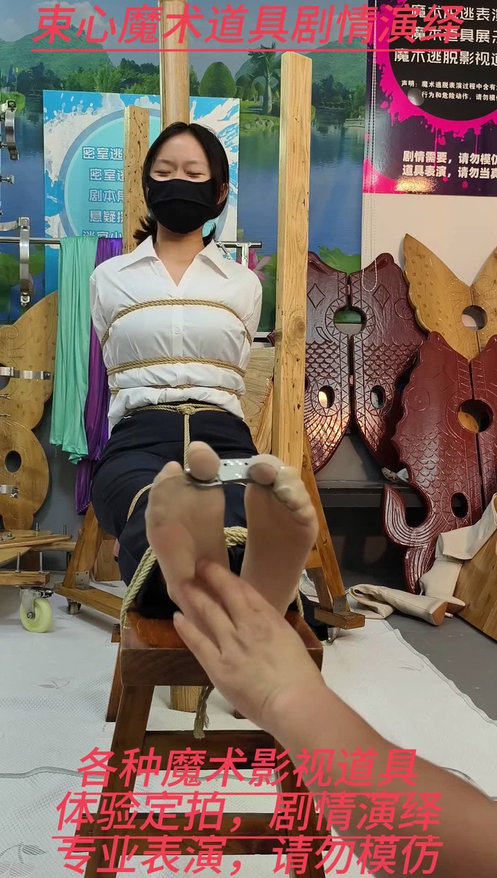 #束心工作室 兰兰白色衬衣套装,老虎凳捆绑挠脚心,拇指铐铐脚趾,红色高跟鞋里面放黄豆,鞋子绳子固定,绳子项圈牵引,手铐脚镣.mp4